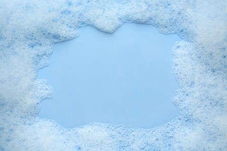 Soap foam. Background of dusty foam with bubbles of blue color for an inscription. Soap sud with copy-space