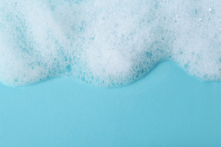 White skincare cleansing foam bubbles on light blue background. Soap, shampoo or shower gel foam texture, close-up, top view