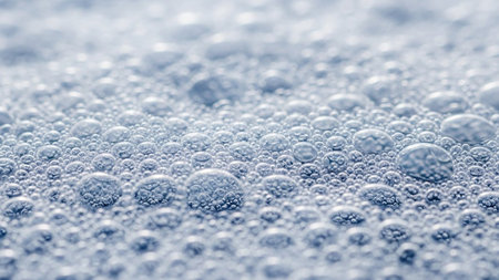 A detailed macro view of countless small, spherical water bubbles creating a textured, light blue surface with...
