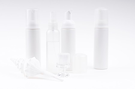 Cosmetic white pump bottle mockup. Dispenser spray with gel for intimate hygiene, shower gel, shampoo. Blank template for your design, beauty product packaging. Minimalist style.