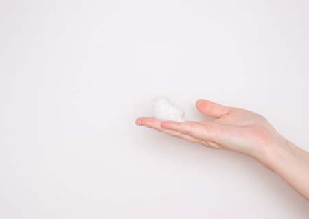 Foam for washing on the palm of the hand on a light background. Free space for text. Cleanser, facial cleansing, skin care.