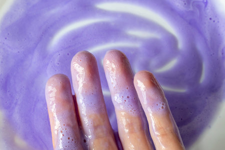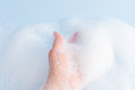 A close-up of a hand immersed in soapy water, surrounded by soft bubbles, capturing the essence of relaxation and personal care in a serene bathing setting.