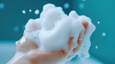 A hand filled with soft soap bubbles against a serene aqua backdrop, symbolizing cleanliness and relaxation.