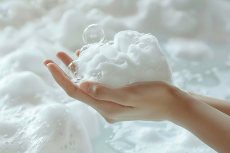 Hands holding a handful of foamy soap bubbles. Cleanliness and hygiene in a soft setting