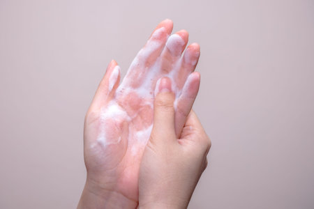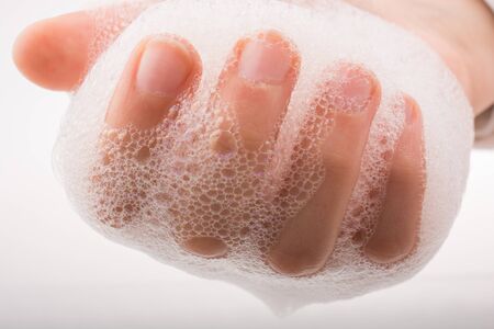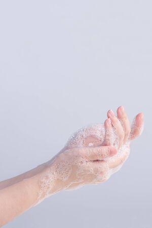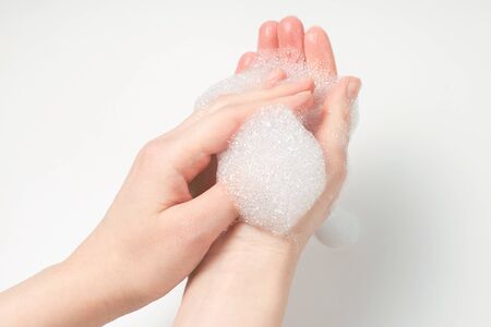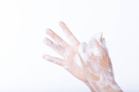 Closeup woman washing hands with soap on white background. Healthcare and disinfection concept.