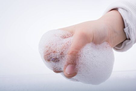 Foam with large bubbles in his hand on a blue background. The concept of active cleaning in the apartment