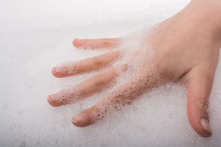 Woman's hand in delicate white foam cosmetics, bath foam, shower gel, soap. The concept of SPA, water treatments. A copy of the space.