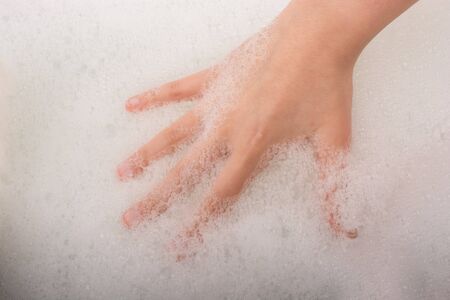 Woman's hand in delicate white foam cosmetics, bath foam, shower gel, soap. The concept of SPA, water treatments. A copy of the space
