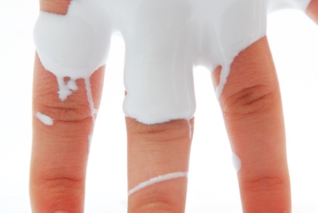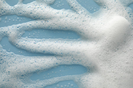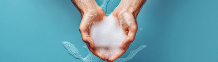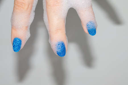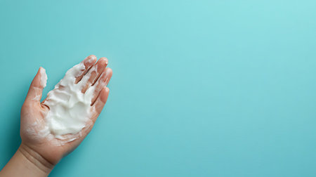 Hand with white bubble foam, isolated on blue background, copy space template, banner.