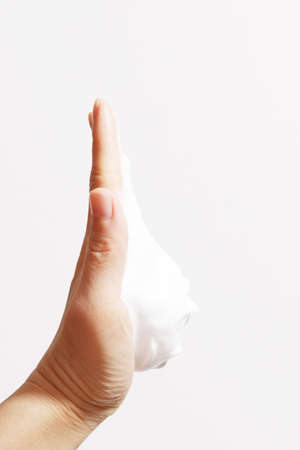 white soapy foam bubbles texture on hand. cleaning and wash essence facial cleanser background concept