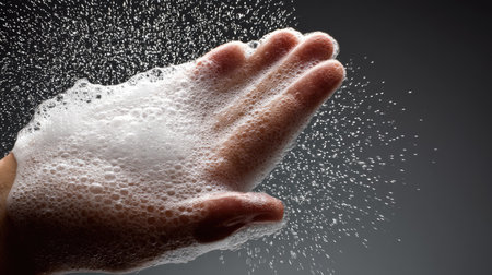 A close-up of a hand covered in soap bubbles, creating an artistic splash against a dark background. This imagery emphasizes hygiene, cleanliness, and freshness, ideal for health and beauty themes.