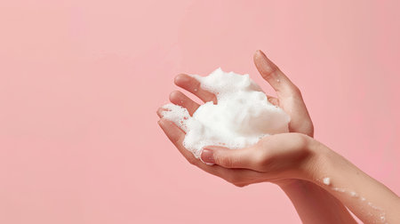 Adorn your hands with silky white foam against a pink backdrop. Embrace beauty and wellness with our luxurious skincare