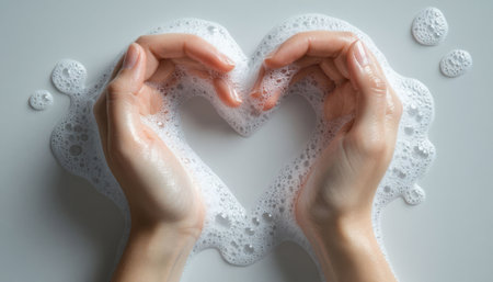Hands lying in layer of foam making heart shape. Idea of clean hands and gentle washing. Light gray background with soft bubbles.