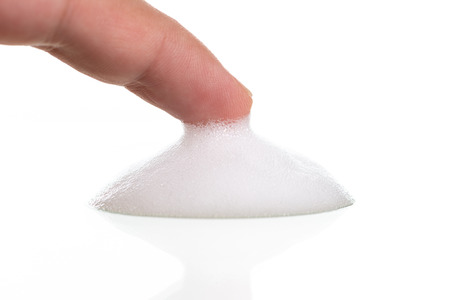 A hand gently explores thick foam on a soothing blue background, evoking calmness.