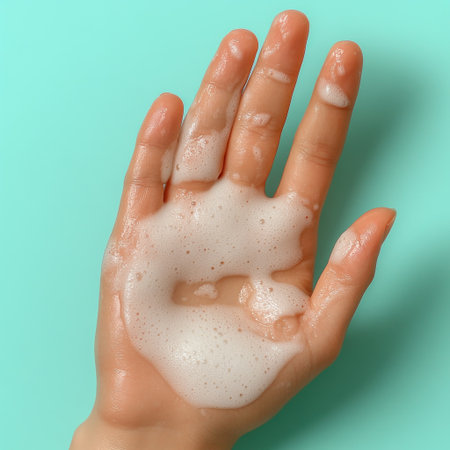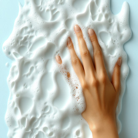 A close-up view of a hand lathering with soap, creating a rich texture of bubbles and foam. Ideal for themes of cleanliness and personal care.