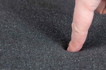 Finger pushing black foam rubber. Closeup full-frame macro view.