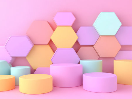 Abstract background with hexagon shape podiums for products presentation or exhibitions. Composition of different geometric objects with copy space.