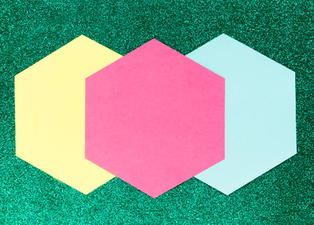 Brightly colored hexagonal shapes are arranged on a backdrop of patterned and textured papers, creating a vibrant and playful composition.