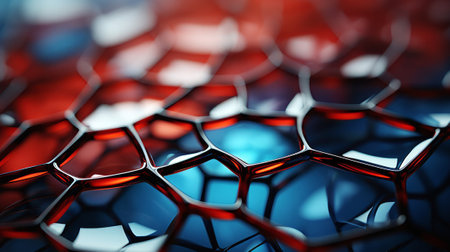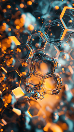 Complex hexagonal molecular structure forming network, ideal for science, technology, and communication concepts