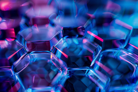 Glowing hexagonal grids in metallic and holographic tones create a mesmerizing display