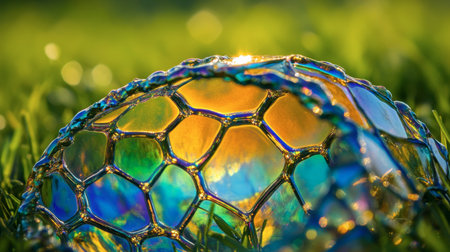A vibrant soap bubble resting on green grass, showcasing stunning reflections and an iridescent pattern. Ideal for nature and abstract themes.
