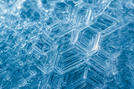 A detailed abstract background showcases a hexagonal pattern with crystal ice texture. Cold blue and white tones create a frozen aesthetic, highlighting smooth reflections and a futuristic style.