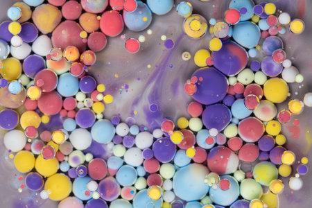 Colorful abstract arrangement of floating paint droplets on a surface creating vibrant patterns in a creative art setting