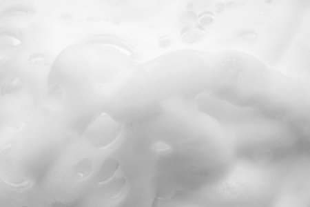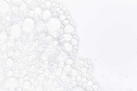 Foam background. Liquid soap bubbles, Froth bubbles backdrop. Soap foam popping bubble, white backdrop. Soap sud macro structure close-up. Clean, cleaning, washing, laundry