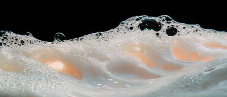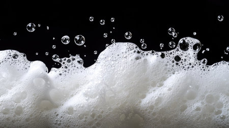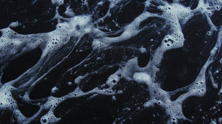 close up view of white and black foam on marble surface creates striking contrast, evoking sense of cleanliness and freshness. bubbles add texture and depth to image.