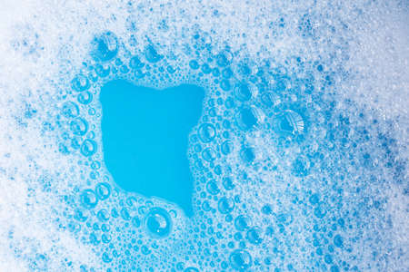 White soap foam with bubbles texture on blue background. Detergent foam bubble on water, soap sud