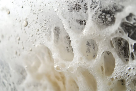 Bright white bubbles and foam form an intriguing, abstract pattern against a dark background, capturing the essence of a cleaning process with texture and movement