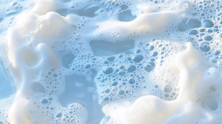 White and blue bubbles from detergent on water surface, with varying bubble sizes and light reflections. Clean and fresh atmosphere