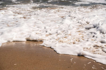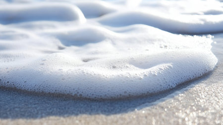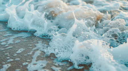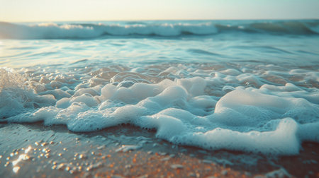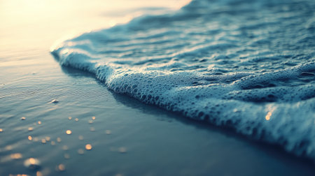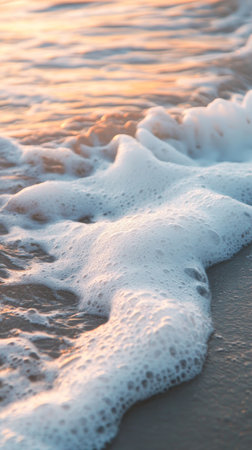 A close-up of gentle ocean waves with foam washing over a sandy beach, evoking a sense of tranquility and natural beauty perfect for relaxation.
