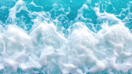 This captivating image showcases foamy waves rolling up the ocean shoreline under a brilliant sky, illustrating natures beauty and the soothing yet dynamic power of the sea as it endlessly meets