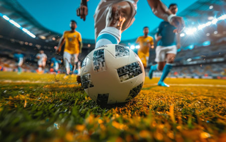 Soccer ball on a field with players running during a championship game