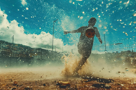 Player skillfully controlling soccer ball at sunset with water splashes in slow motion captured in close-up