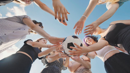 Summer fun, teenage girls in a circle with a soccer ball