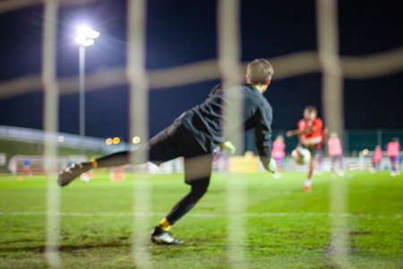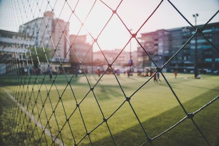 View through football gate net during a football mach. Goal keeper wait in front of gate line