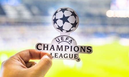 September 12, 2021, St. Petersburg, Russia. The emblem of the UEFA Champions League against the background of a modern stadium.