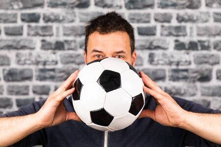 man holds a soccer ball in his hands against a stone background