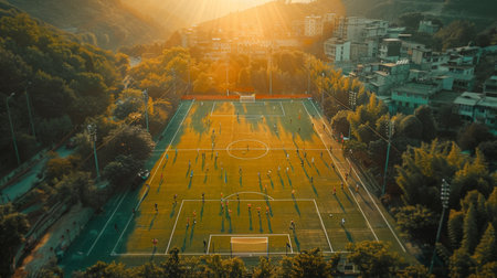 Aerial view of football field with people playing soccer at sunset.