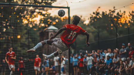 A young player executes a stunning kick while spectators watch with excitement as the sun sets
