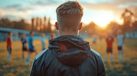 Back view of male soccer or football coach in white shirt with word COACH written on back, standing on the sideline watching his team play, good for sport or coaching concept