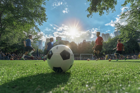 Players engage in a vibrant soccer match within a lively park. Sunlight filters through the trees, casting a warm glow over the dynamic scene filled with energy and competition.