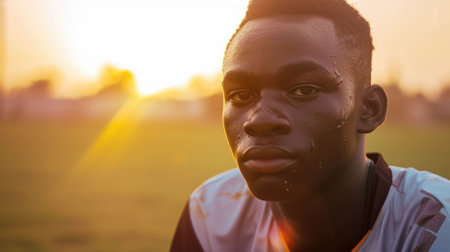 The close up picture of the african soccer or football player is exhausted after exercising or playing football, the football player require training, physical endurance and football technique. AIG43.