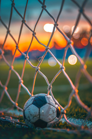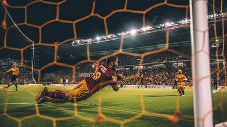 A captivating close-up view of a soccer goal net with a blurred stadium background, illustrating the excitement and energy of a live game day atmosphere.