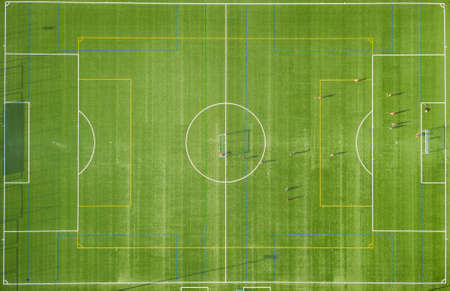 Players are playing a soccer match, aerial shot with a drone from a altitude at summer day.