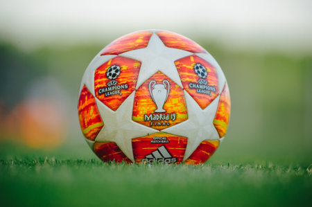 KHARKIV, UKRAINE - JULY 6, 2020: Adidas ball of UEFA Final in Madrid 2019. Football match of Ukraine league Zhitlobud-1 - Mariupol