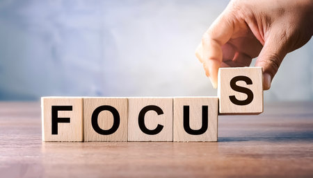 FOCUS - a word made from wooden cubes with black letters, on a yellow background, near a magnifying glass.