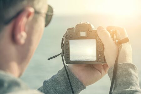 Photographer sitting and checking pictures in camera with back screen of camera when breaking